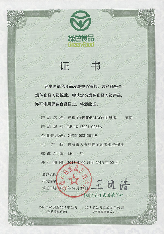 ● 2013年2月,临海市大石旭东葡萄专业合作社的产品荣获中国绿色食品发展中心颁发的《绿色食品证书》。