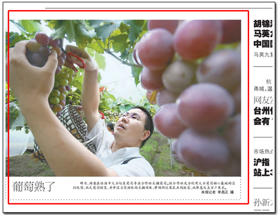 ● 2010年7月27日,台州日报、台州商报记者专程来到本合作社位于临海市河头镇五景岙村的葡萄基地联合采访了合作社理事长陈旭东,新闻刊登在7月28日的台州日报2版和台州商报头版,引起了很大反响。